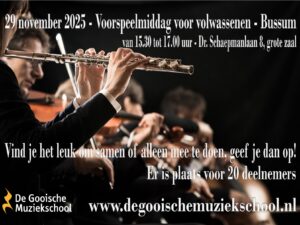 Op zaterdag 29 november 2025 van 15.30 tot 17.00 uur organiseert De Gooische Muziekschool een voorspeelmiddag voor volwassenen in de grote zaal van de muziekschool aan de Dr. Schaepmanlaan 8. Leerlingen van andere locaties zoals Huizen, Laren en Weesp mogen hieraan uiteraard ook deelnemen. Als jij het leuk vindt om op te treden en te laten zien wat je inmiddels hebt geleerd, meld je dan aan.