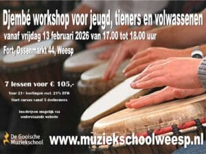Een djembé workshop voor ouder & kind, kom ontdekken hoe leuk en divers dit instrument is. Workshop is voor kinderen vanaf 7 jaar oud. Workshop vindt plaats in de kleine zaal op de eerste verdieping.
