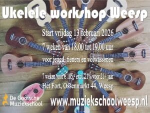 Een ukelele workshop voor ouder & kind, kom ontdekken hoe leuk en divers dit instrument is. Een kleine versie van de gitaar met een unieke sound. Workshop is voor kinderen vanaf 7 jaar oud. Workshop vindt plaats in de kleine zaal op de eerste verdieping
