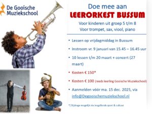Van vrijdagmiddag 9 januari 2026 gaan we van start met het Naschoolse leerorkest Bussum op de muziekschool aan de Dr. Schaepmanlaan 8, Bussum.