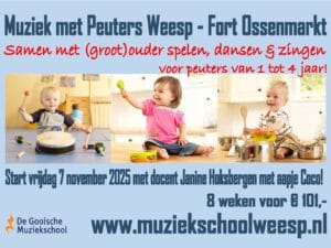 De Gooische Muziekschool gaat weer van start met Muziek met Peuters. Een leuke en energieke muziekcursus voor (groot)ouders en hun (klein)kinderen. Muziek met Peuters is een cursus voor kinderen tussen de 1 en 4 jaar samen met hun (groot)ouders met als doel om op zeer eenvoudige en speelse manier kennis te maken met muziek. Samen lekker zingen, trommelen, klappen, stampen en dansen maakt het gezellig.